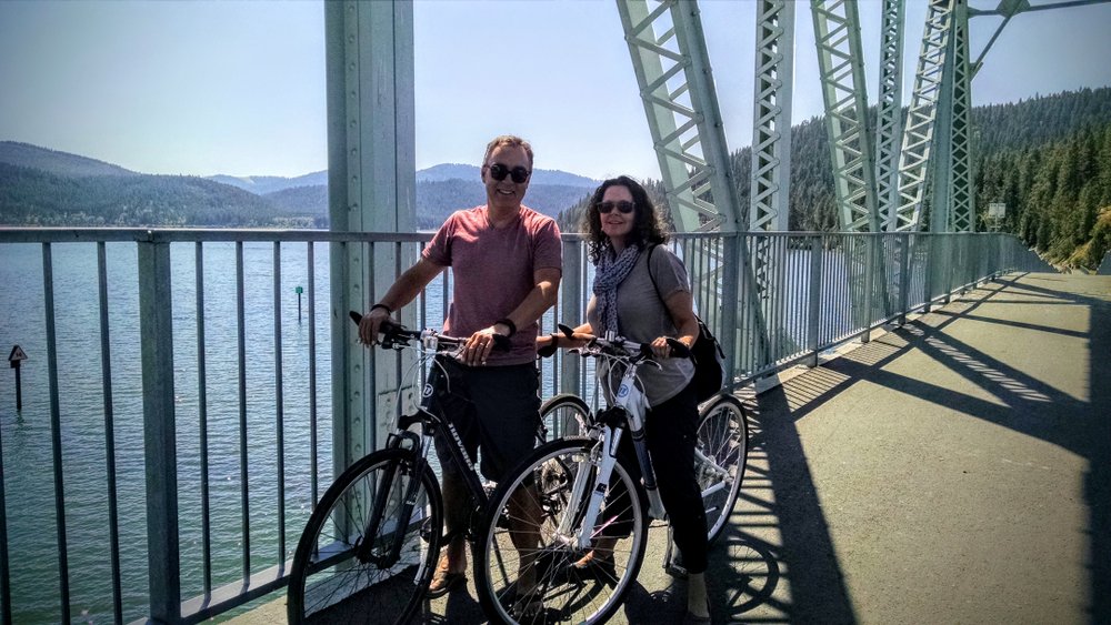 Our first ride was the Trail of the Coeur d’Alenes, which is paved for 71 miles. We cycled along for just 15 of those miles at a section of the trail that runs alongside Lake Coeur d’Alene from Harrison. The trail hugs the shoreline until you pass over an old rail bridge to the other side at Heyburn State Park.