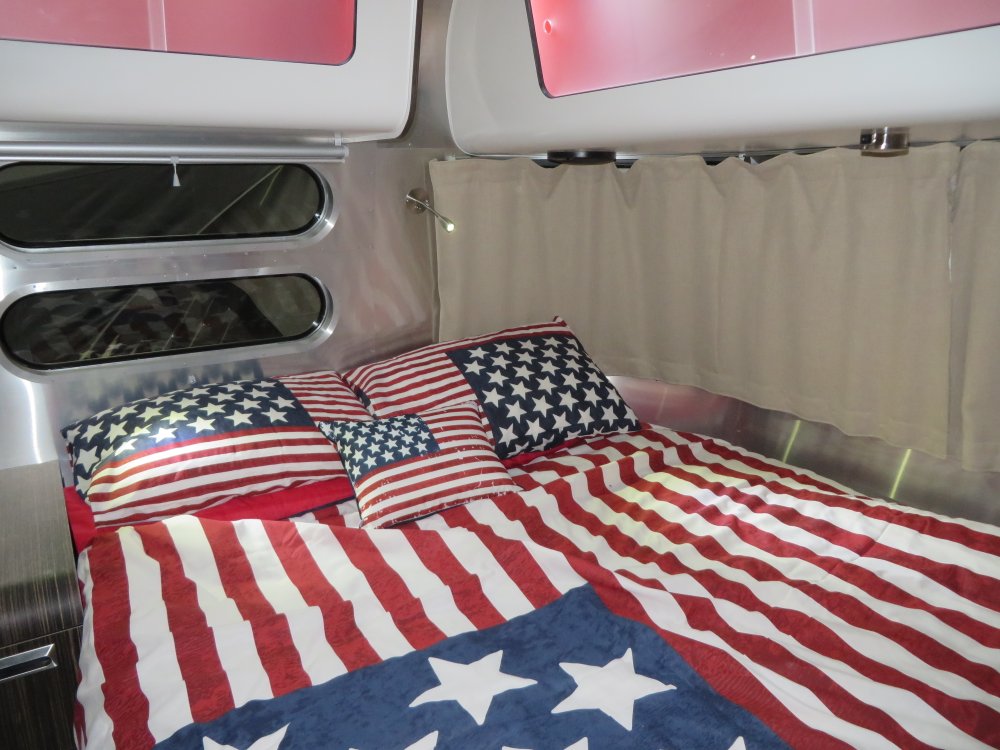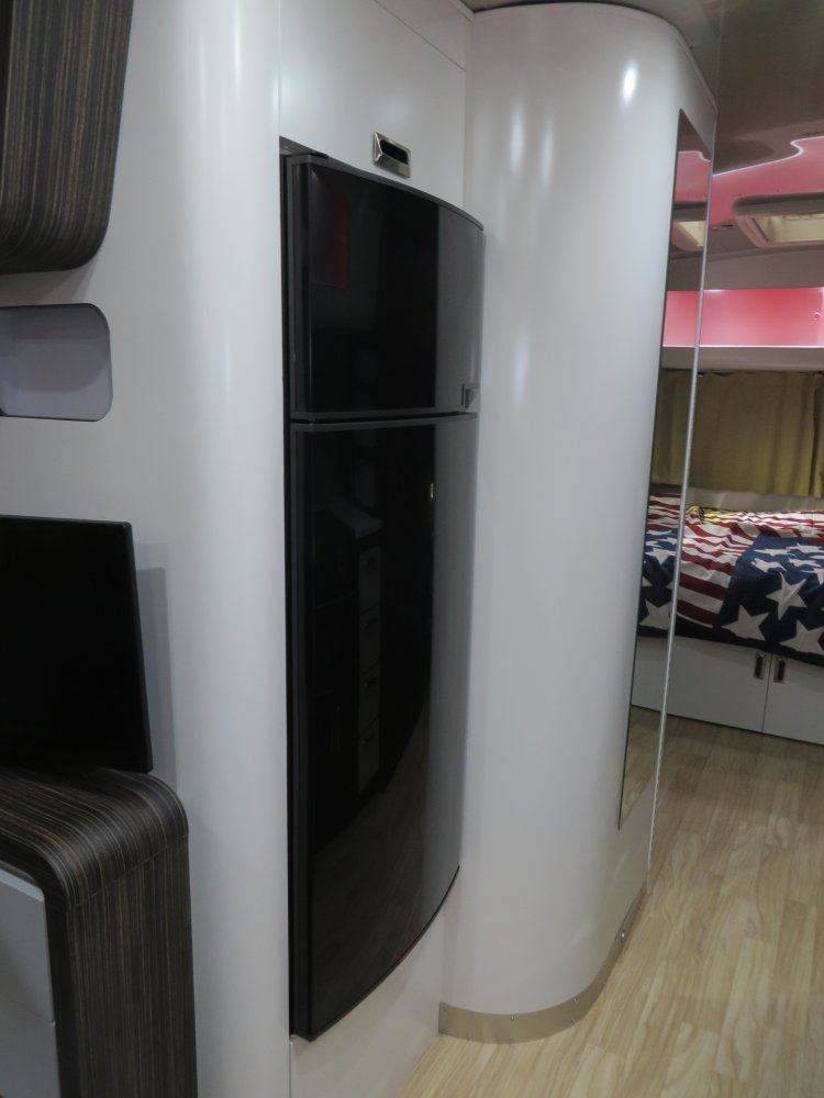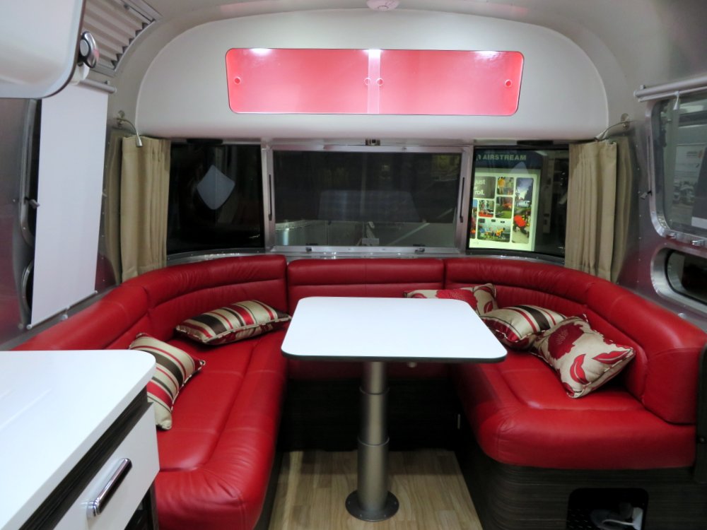 The interiors also have some key differences. Everything is finished to a more European focused design aesthetic. In other words, none of your grandma fabrics and oak cabinets with brass fittings here! All models are made available only in Airstream’s International trim, the most modern of the available decors. Even so, there are still some key differences. The base cabinetry is similar to our darkwood but I drooled over the beautiful crisp white Corian counter tops. I have never liked the beige color installed as standard in our Airstream. It is so out of place with the rest of the modern design that have long been planning on replacing it. Seeing this design in person confirmed that the white tops are much more to our taste. The drapes and upholstery are also better quality as is the seat foam – all things we were also planning on changing in the near future.