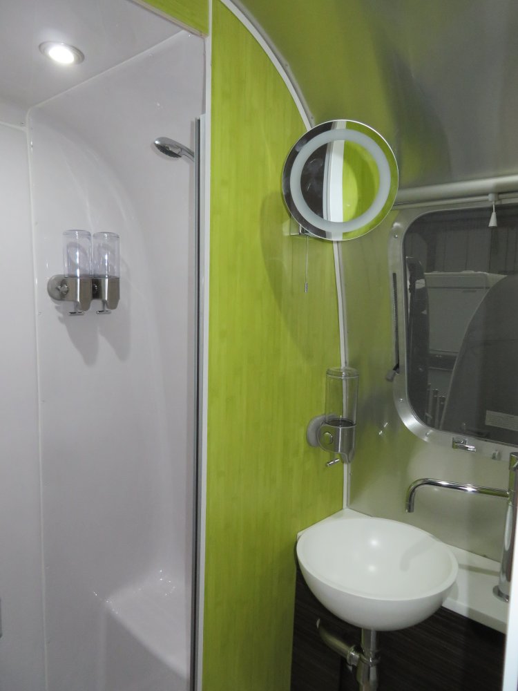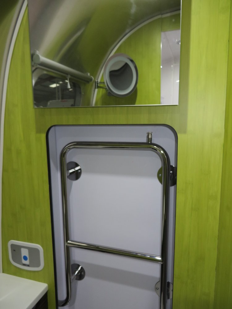 The appliances are also of a higher grade. The swanky all stainless stove top and oven (limited to just the new Classic model in the US) is something we have had our eye on as an upgrade for our trailer. The fridge freezer is also a more attractive design. The bathroom contains a cartridge toilet, which seems to be something that is standard in Europe. I am guessing that is due to the lack of a dump station infrastructure or the sewer hook-ups found in North American campgrounds but I am not 100% sure. They have water based central heatingย which enables the absolute best thing for me in the whole trailer; a heated towel rail. I have been joking with Iain for months about really wanting one and low and behold, here it is as part of the heating system! I am very envious of this feature.