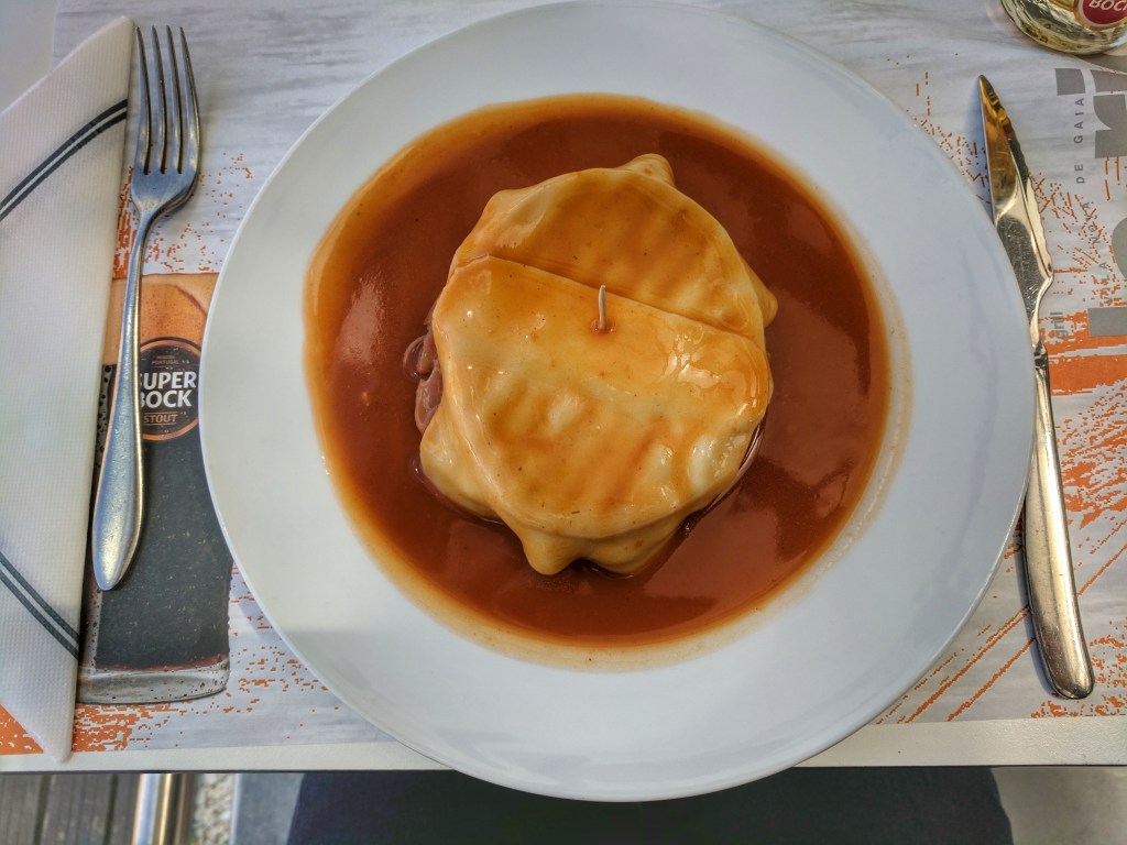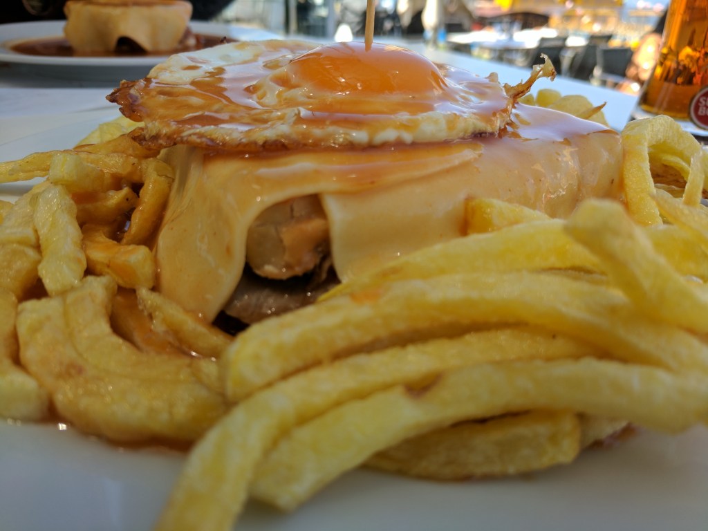 For lunch we had a local famous Porto dish called the Francesinha. It is pretty much the definition of comfort food. It’s a huge soggy sandwich filled with various meats. I counted five types in mine covered in cheese and smothered in a beer/tomato sauce. Iain chose to go for extra-comfort with the egg and fries version.