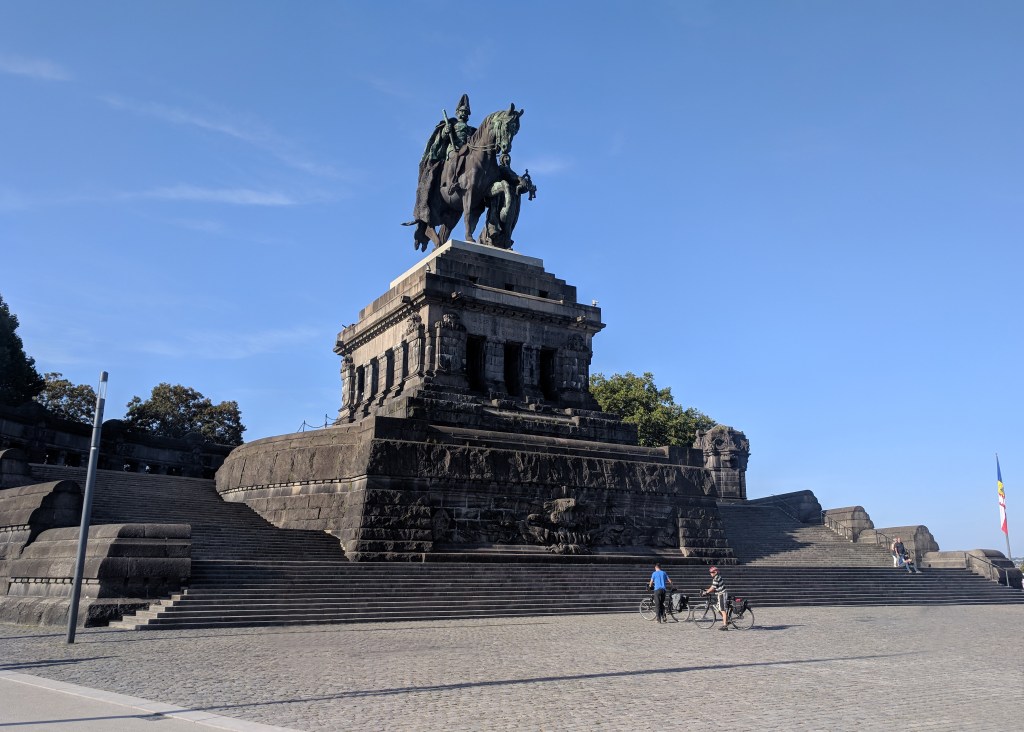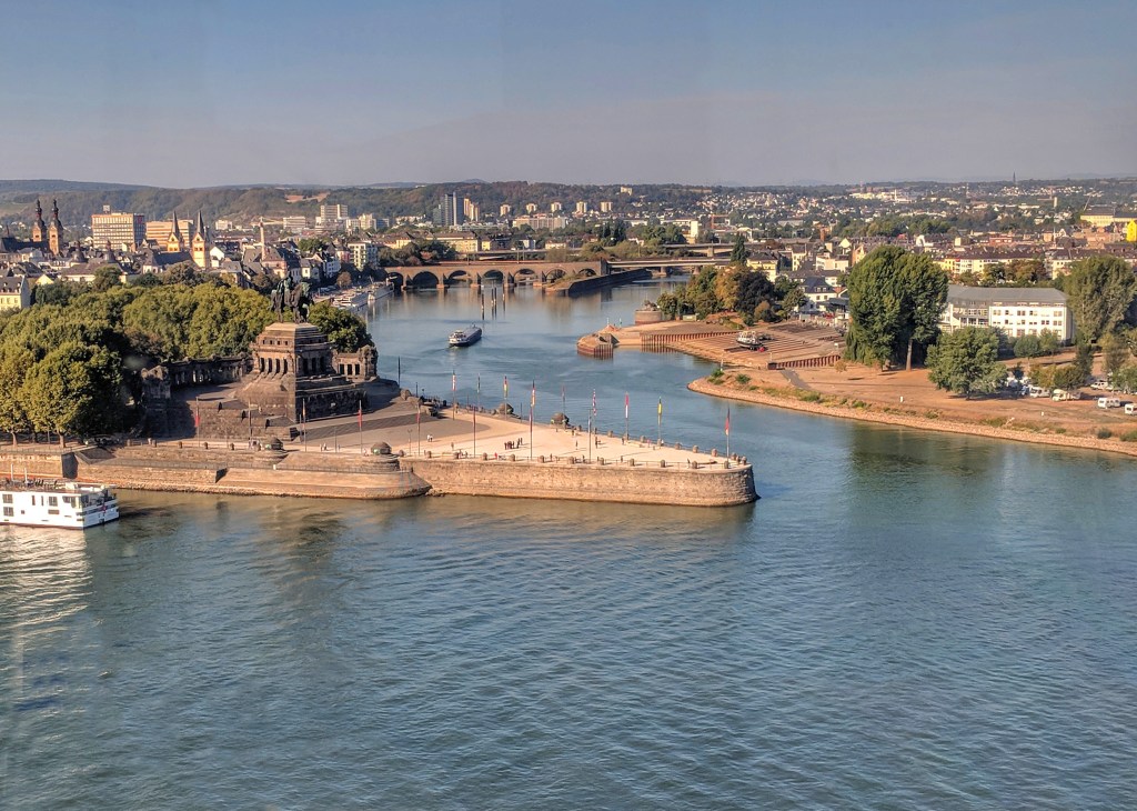 We rode the cable car the next day, getting up early to make sure that the city was bathed in the light of the morning sun. To reach the city from the campsite you can take a 20 minute walk across a bridge or for just 1.30 Euro (£1.15) you can hop on a little ferry that drops you right at the German Corner in just a few minutes. It’s a short walk to the cable car from there and we were rewarded for our early start with no fellow passengers. It’s 9.90 Euro (£8.76) for a return trip, and an extra 3.90 (£3.45) if you decide to visit the Ehrenbreitstein Fortress as well. We opted for just the ride and then took a pleasant walk around the park which has a viewing platform that allows you even more expansive views of the Rhine as it makes its way north to The Netherlands.
