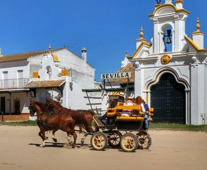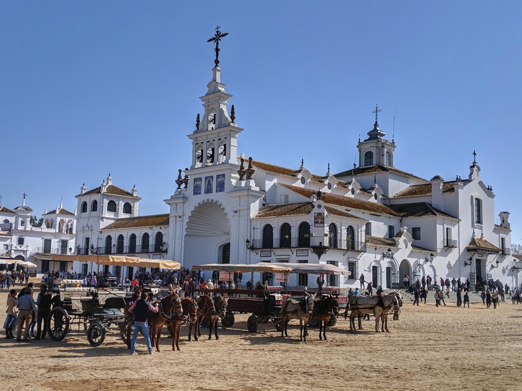 Although the main pilgrimage is once a year, every weekend several brotherhoods visit the city and parade to the Hermitage, the beautiful church in the center of the town, to offer flowers to the Virgen. As the weekend approaches the town fills up, until on Sunday the parades begin. Every hour a different brotherhood descends on the church.