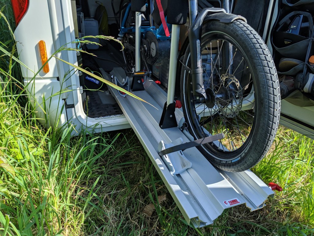 Garage Bike Rack We keep our bikes inside our garage. They are quite heavy and unwieldy to move around so the sliding Fiamma rack is a back-saver. It is also bolted to the rig, and we secure our bikes to it when we travel for even more security.