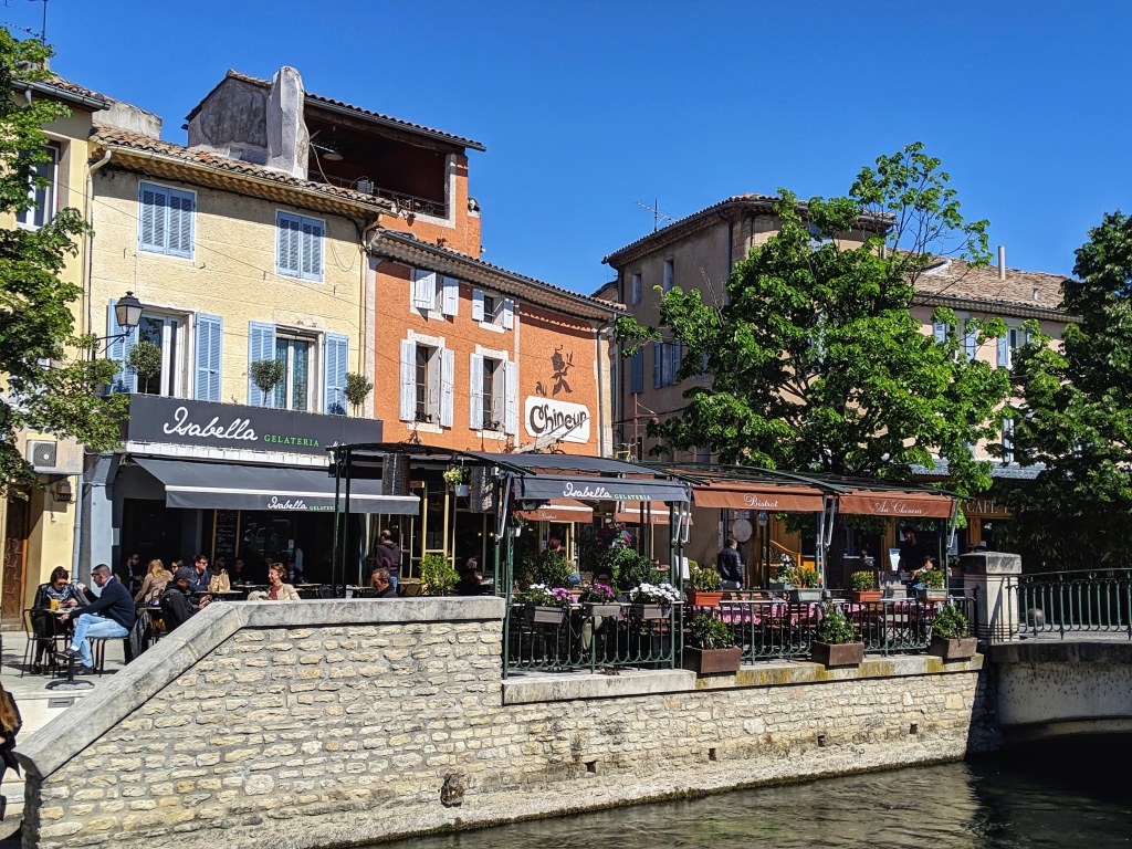 On our first day we headed east from the city with a list of some well-chosen villages that we hoped would give us a flavor of the area. First stop was L’Isle-sur-la-Sorgue. We didn’t visit on market day, although I hear that is quite the thing, but the town still has a lot to offer; a gorgeous setting surrounded by water (hence the “‘isle”) with charming narrow streets and pretty storefronts. You will find everything you expect from reading about the area. We are not into antiques but this town seems a perfect place if mooching around looking for treasure is your thing.
