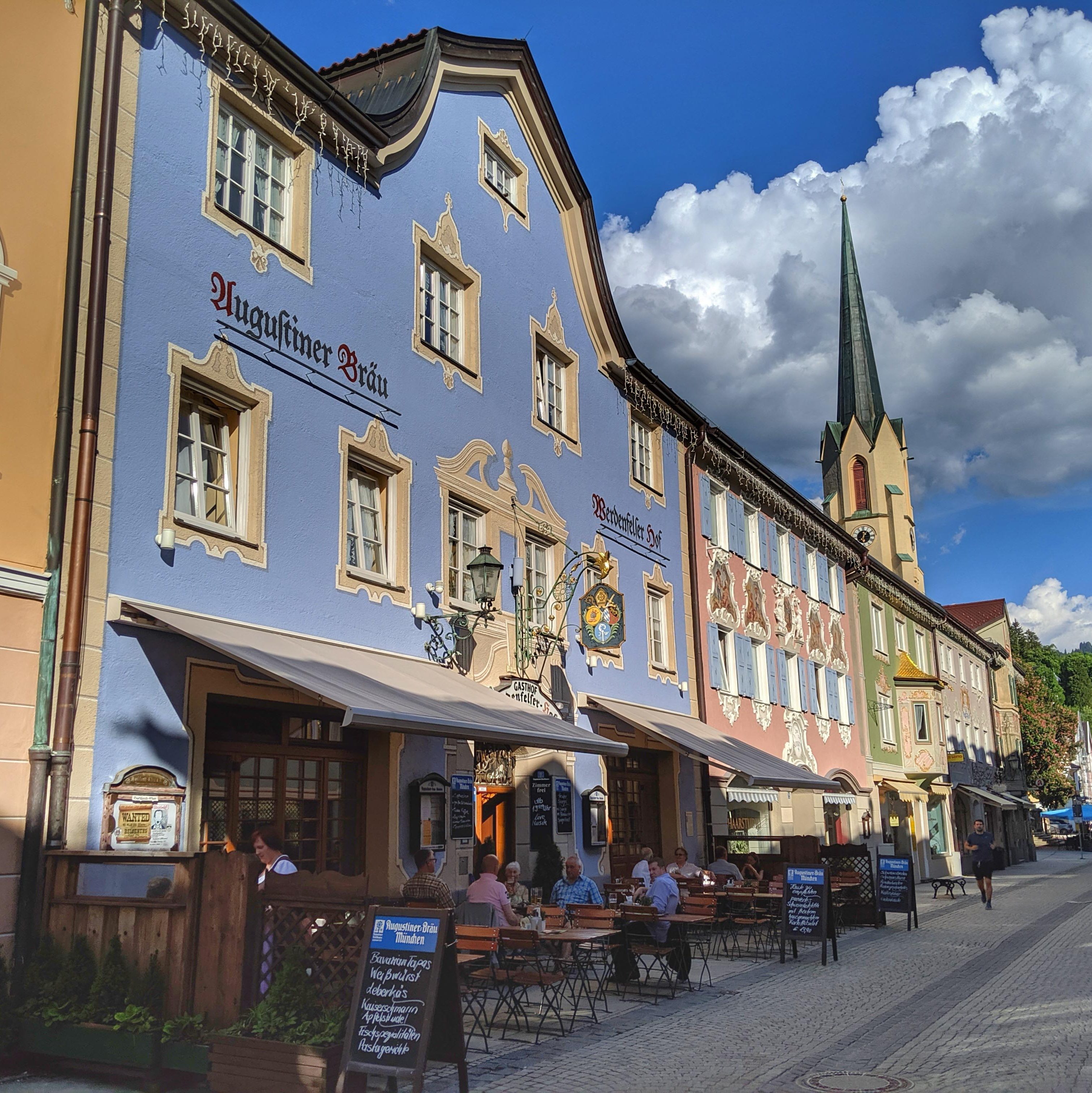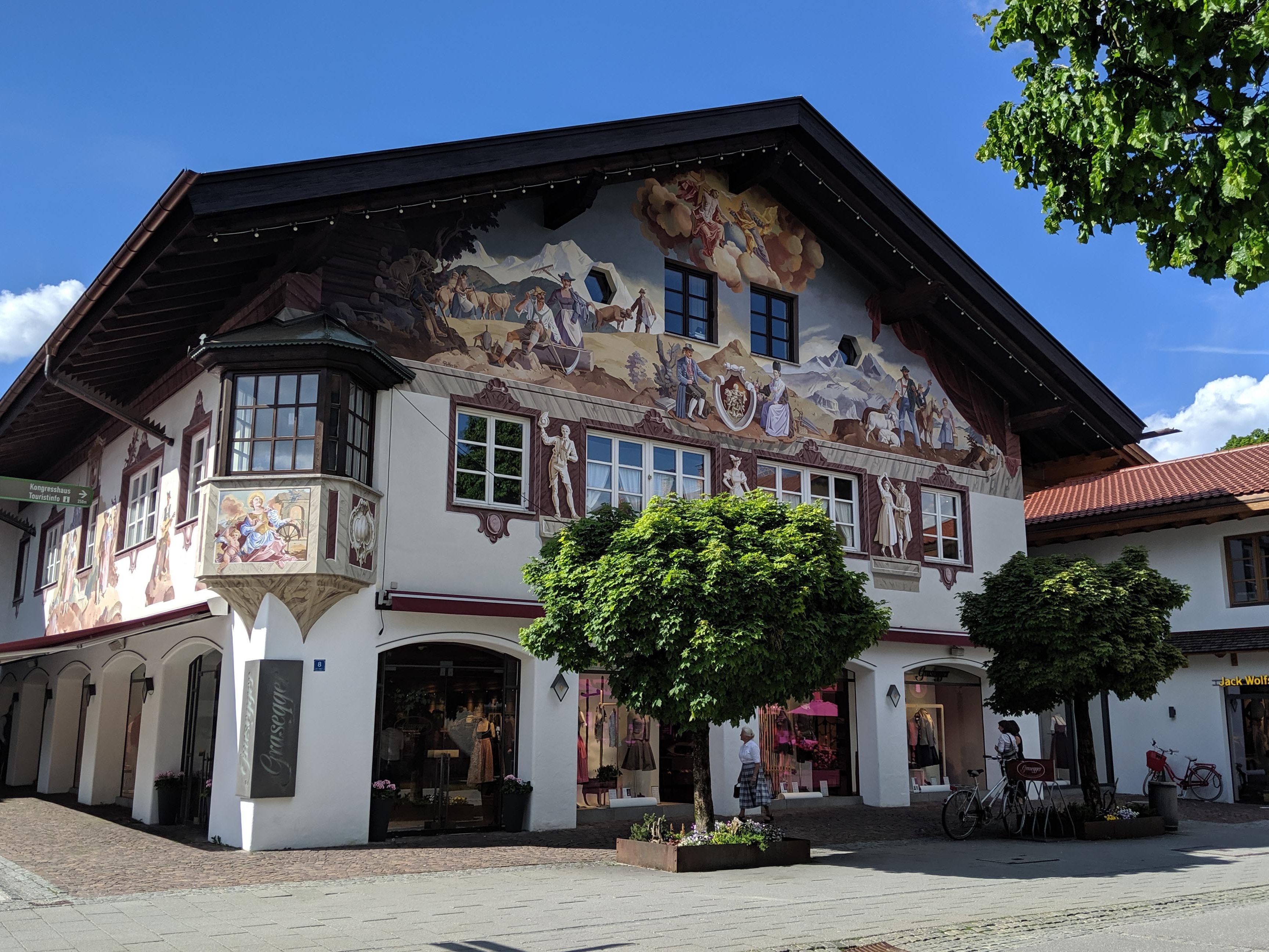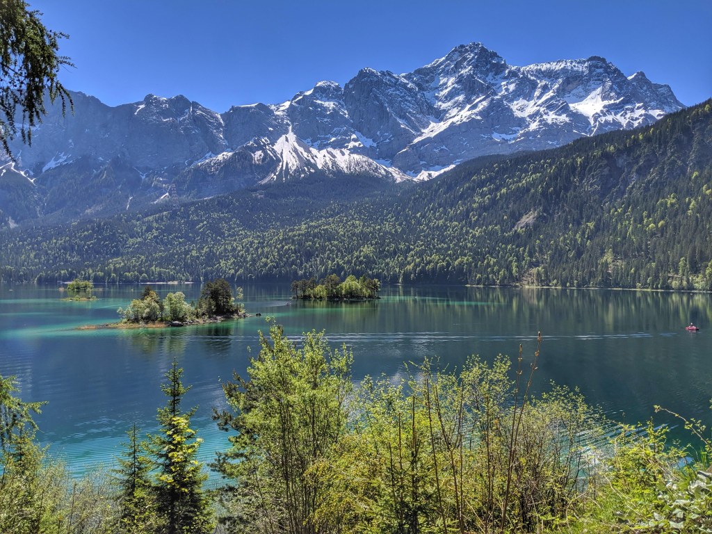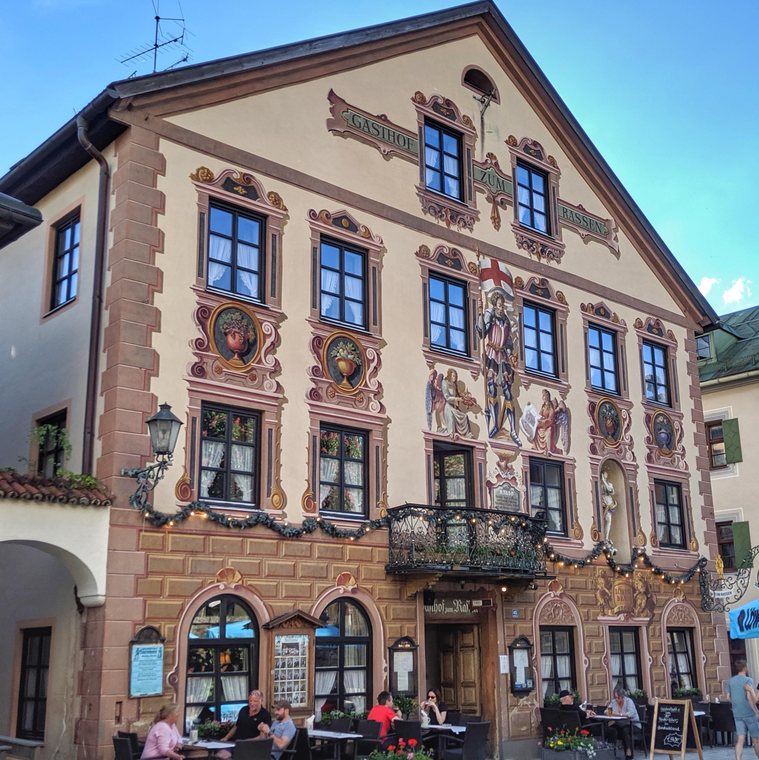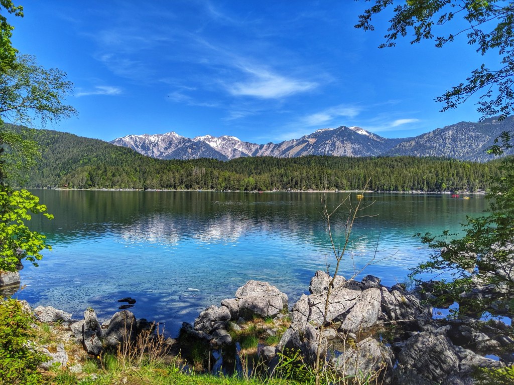 I would say that GAP is easily one of the most beautiful places we have visited in Germany. The stunning natural setting in the foothills of the Alps is amazing. Even in early June the previous inclement weather gave us wonderful snow-capped peaks and, now that the clouds cleared, we could finally see the Alps in all their glory. The highest peak in Germany, the Zugspitze, overlooks the area. We decided to forego the cable car to the top and instead cycled to and around the beautiful Lake Eibsee to view it from below and enjoy the long-awaited sunshine.