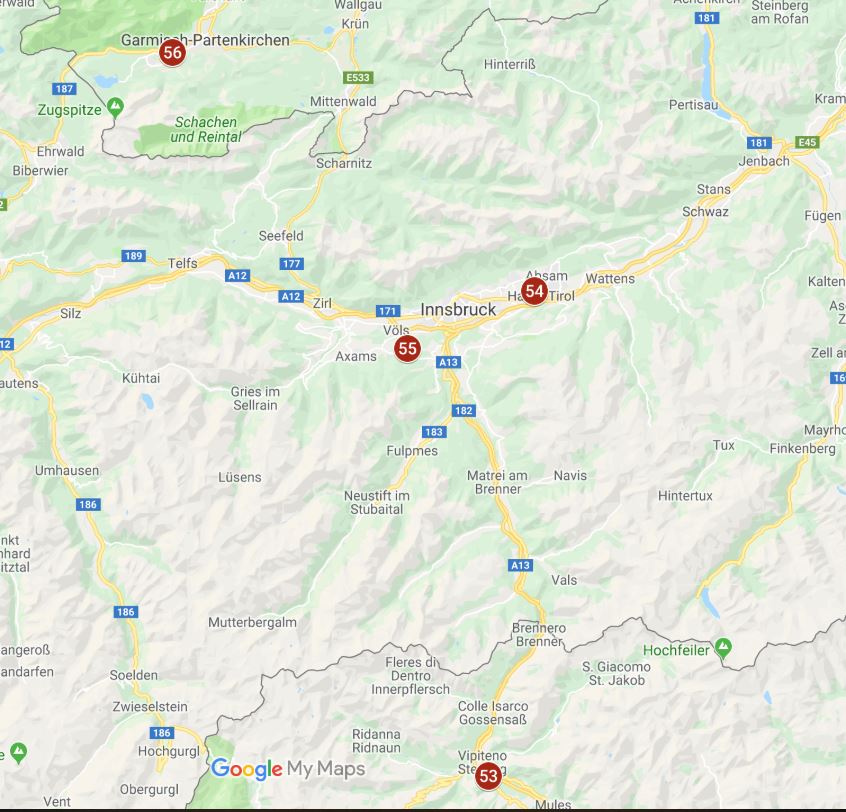 53. Autocamp Sadobre: Really just a parking lot, but close to the Autostrada and convenient for a nights sleep before the Brenner Pass. 15.70€ a night with elec. GPS 46.88096, 11.43912