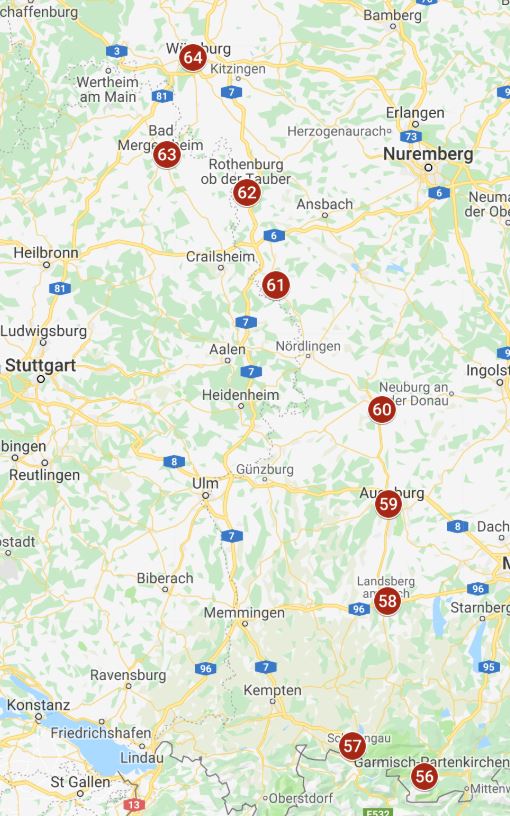 60. Donau Lech Camping, Oberndorf am Lech. In need of laundry we made a one night stop at this remote campsite. Perfectly nice and not too far off the Romantic Road. 20€ a night with elec GPS:48.67576, 10.84122