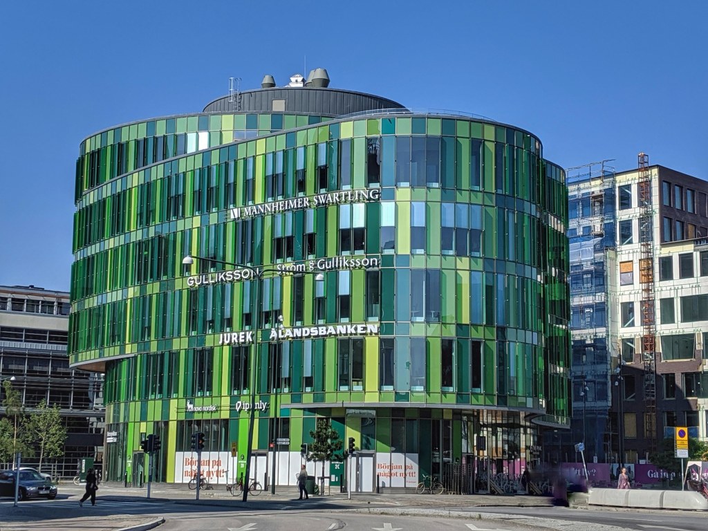 The Rostock ferry was uneventful, a half empty boat and a 6 hour journey. The cost was around 80 Euros for both of us and the motorhome, which seemed a good deal for all the ground we were covering and easily cheaper than the price of diesel and toll bridges to get to the same point by road. We arrived mid afternoon and headed up to Malmo to spend the night. We took a cycle ride throughthe city and were mightily impressed with what we saw. It’s an interesting mix of old and new and a fabulous setting on the water with lots of green space and people frolicking around enjoying the summer weather.